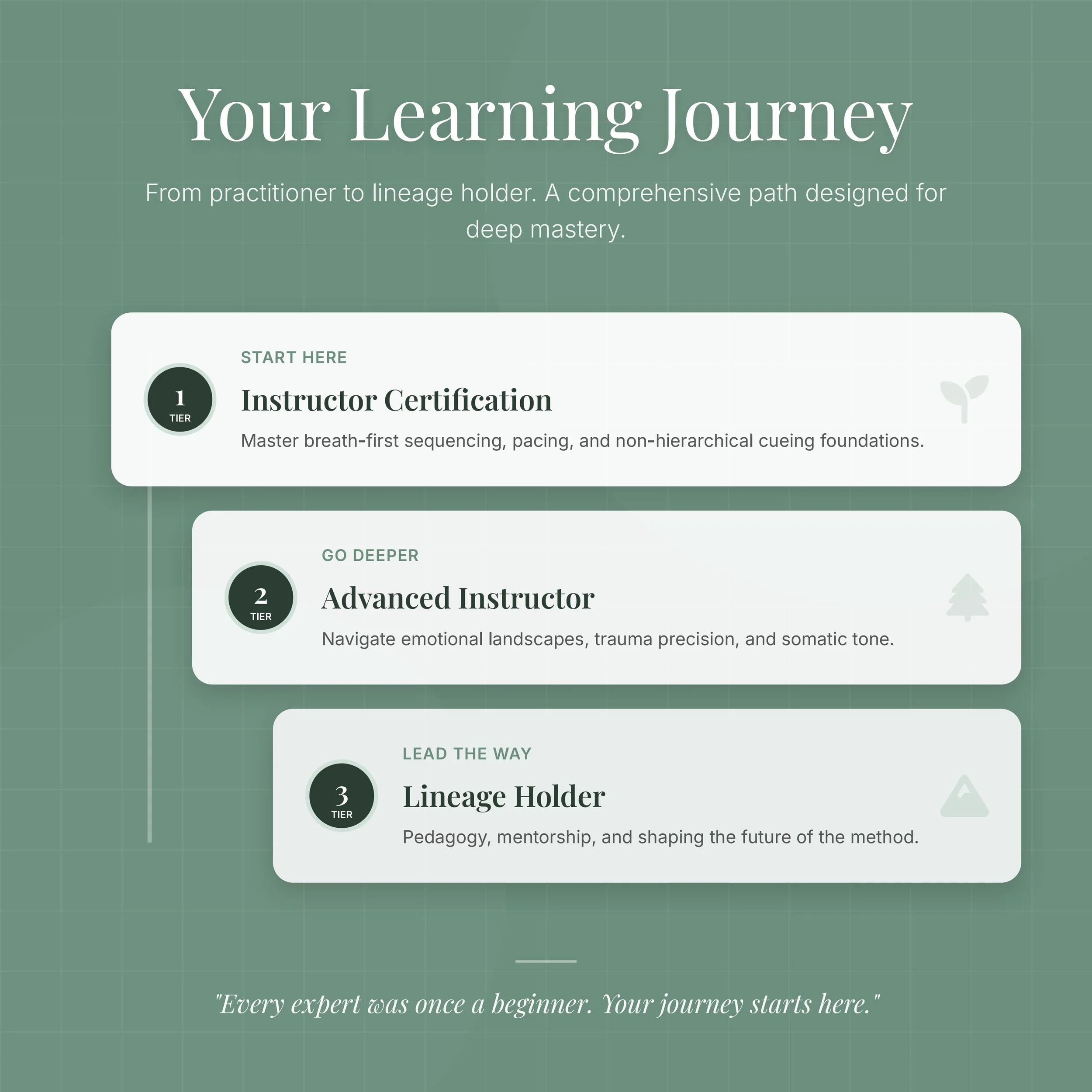 To prepare experienced instructors for mentorship, leadership, and lineage stewardship.
