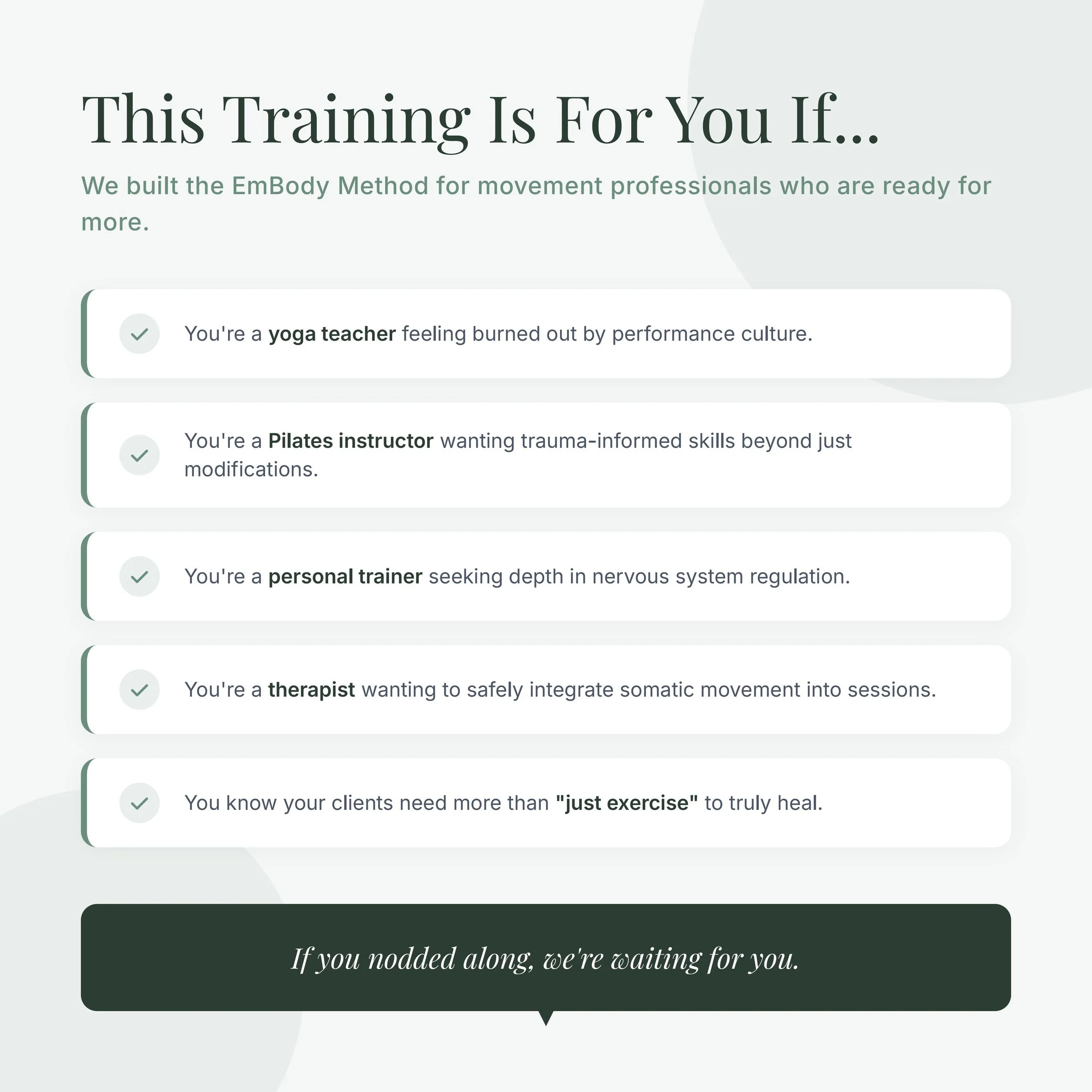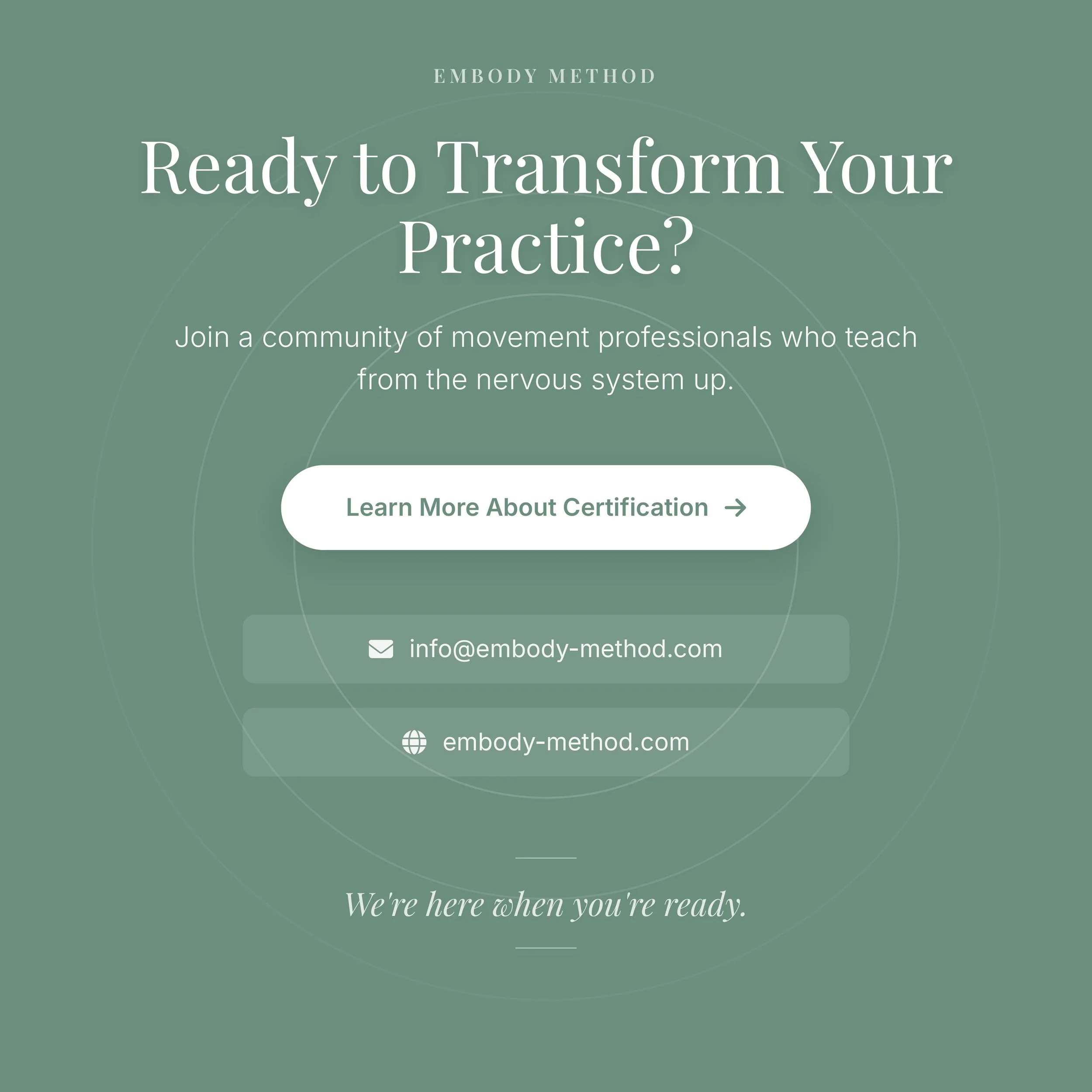EmBody Method training is educational and practice-based. It does not replace physical therapy, medical care, or mental health treatment. The work supports awareness, regulation, and responsible movement instruction within clearly defined, non-clinical boundaries. Instructors are expected to maintain appropriate referral practices and to work within the limits of their training and credentials.